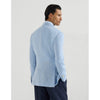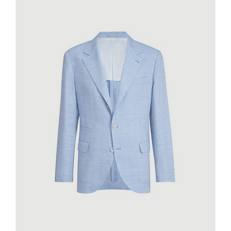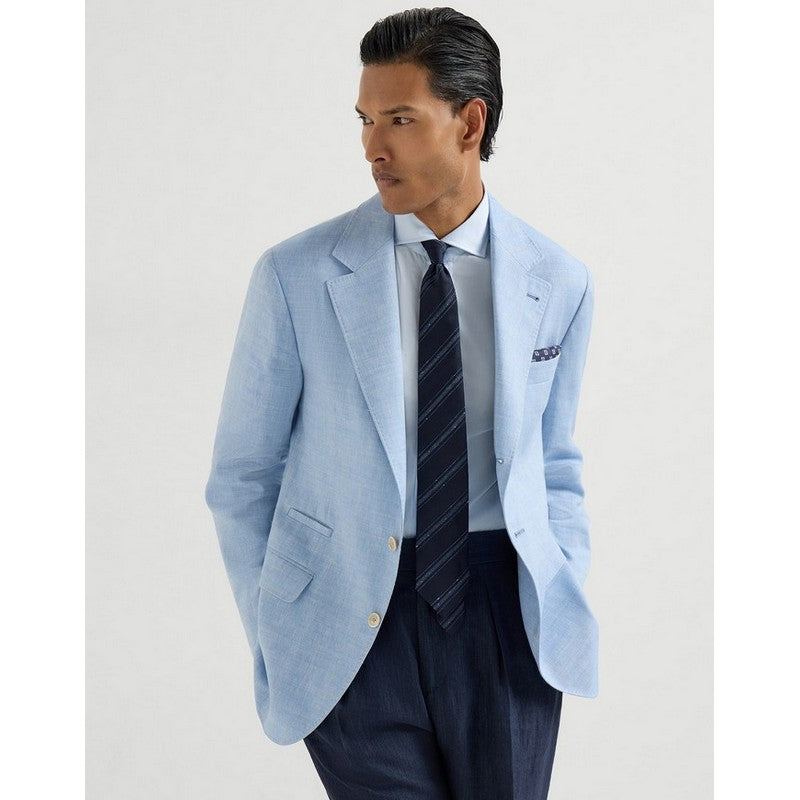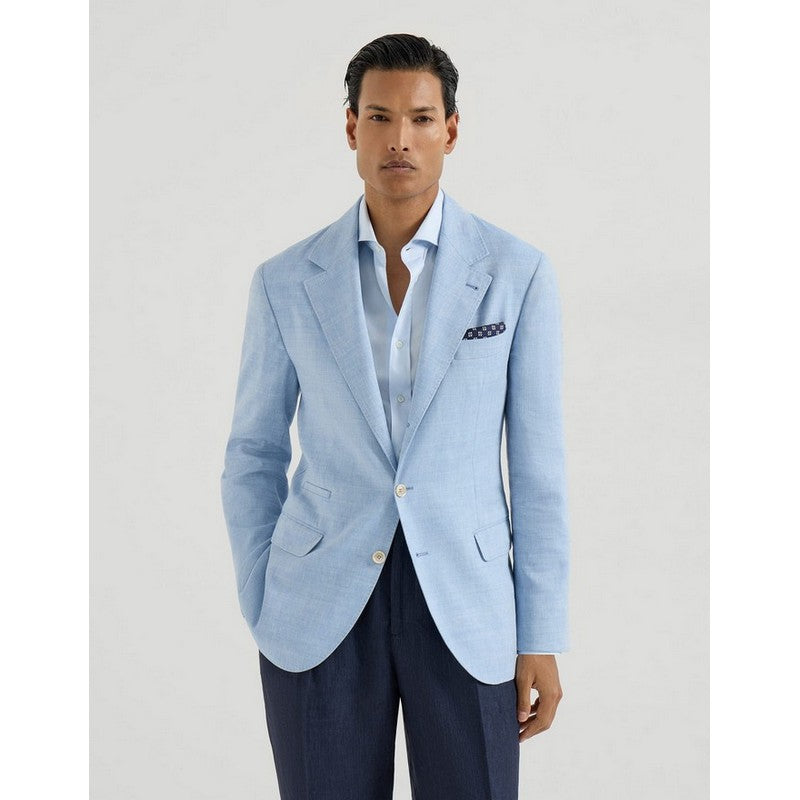 Enriched by the excellence of Brunello Cucinelli yarns, this deconstructed blazer creates a balanced mix of contrasting textures and inspiration. The classic silhouette with lapels and flap pockets is brought to life by the chevron weave of the linen and virgin wool fabric, which is both lightweight and comfortable. The “Solomeo Shoulder”, named after the hamlet where the company is located, characterizes the Brunello Cucinelli blazer with signature proportions. The tapered and pronounced cut of the shoulder enhances the male physique without the need for padding.