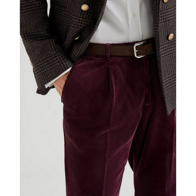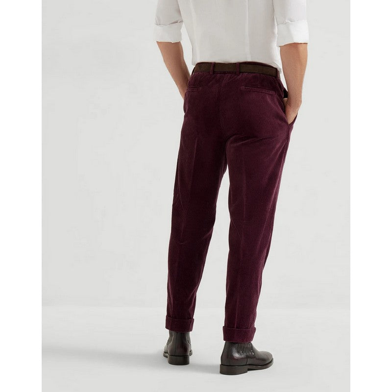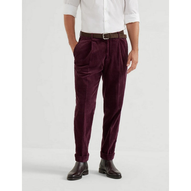 The excellence of Brunello Cucinelli workmanship enriches the essential style of these leisure fit pleated trousers. The design’s casual feel is conveyed by the corduroy fabric, garment-dyed for a distinctive color effect. The modern leisure fit is relaxed in the seat and showcases a sight low-rise, while remaining close to the body down the leg.